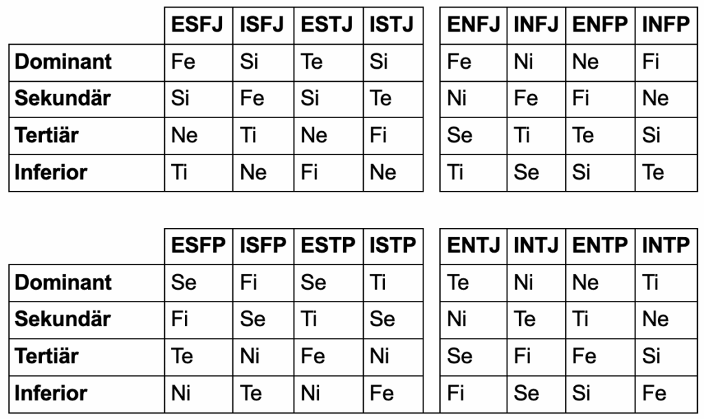 Denna modell formaliserar Jungs idéer och gör dem mer förutsägbara och tillämpbara. Funktionsstacken för varje MBTI-typ definieras enligt en förutbestämd strukturer: