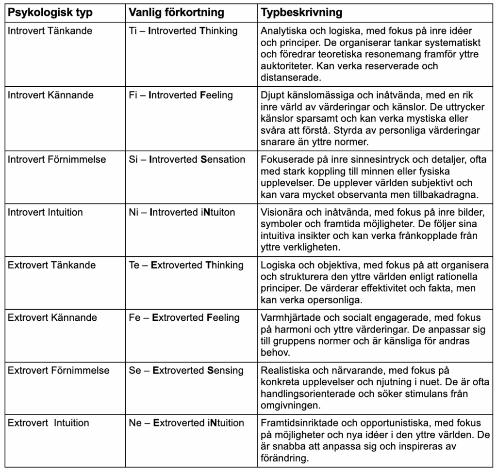 Tabell: Jungs åtta psykologiska typer