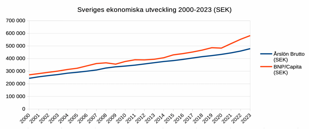 Från 2000 till 2023 ökade de svenska nominella lönerna med 96%. Samtidigt föll reallönerna med 76% (omräknat till kg guld för att justera för inflation och valutaeffekter).